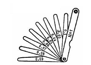 測(cè)量時(shí),根據(jù)結(jié)合面間隙的大小,用一片或數(shù)片重迭在一起塞進(jìn)間隙內(nèi)。例如用0.03mm的一片能插入間隙,而0.04mm 的一片不能插入間隙,這說(shuō)明間隙在0.03~0.04mm 之間,所以塞尺也是一種界限量規(guī)。